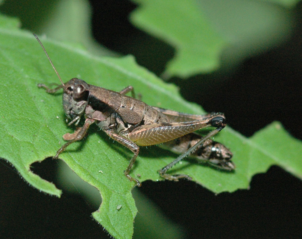 Melanoplus gracilis (female) roosting at night on leafcup (photo by JoVonn Hill)