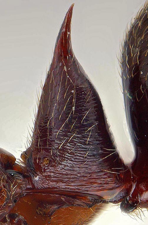 | Smaller, HL usually less than 2.5 mm, WL usually less than 2.75 mm; petiole with coarser striae on the posterior side, finer striae basally on the sides and front; metasternum with notched ridge, but not projecting as elongate spiniform processes (central to southern FL) | |||