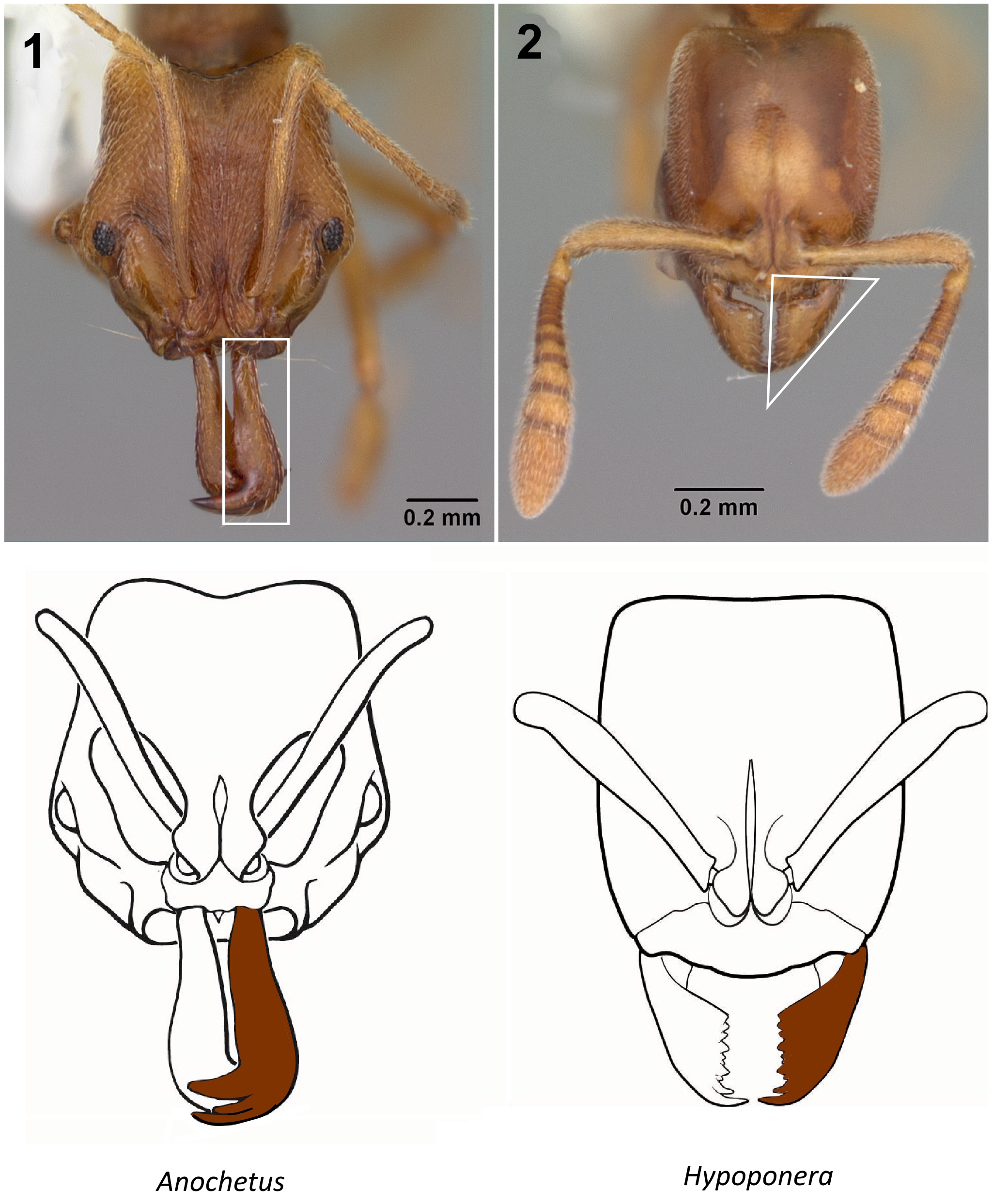 1. Mandible elongate and linear in full-face view, inserted near the midpoint of the anterior clypeal margin; apices abruptly incurved, with 2–3 teeth arranged in a vertical series; mandibular bases closely approximated (Fig. 1) …2 – Mandible linear to triangular, inserted at the anterolateral corners of the head; apices without a vertical series of teeth; mandibular bases distinctly separated (Fig. 2) ...3 2 (1). Nuchal carina converging medially, forming a distinct V-shaped posterior head margin; posterior head surface with paired dark apophyseal lines converging into a sharp median dorsal groove on vertex; dorsalmost tooth of apical mandibular series usually truncated (rarely acute) (Fig. 3) ... Odontomachus – Nuchal carina broadly rounded, forming a continuous curve across posterior head margin; posterior head surface without paired apophyseal lines; median dorsal groove absent or shallow; dorsalmost apical mandibular tooth acute (Fig.4) ... Anochetus mayri 3 (1). Eye minute (maximum diameter ≤ 0.04 mm) (Fig. 5); mesotibia dorsally with numerous stout traction setae extending along most of tibial length (Fig. 6 ) ...Cryptopone gilva – Eye variable (Fig. 7); mesotibia dorsally without numerous stout traction setae (at most a few stout setae near tibial apex, not extending along tibial length) (Fig. 8) ...4 4 (3). Small ants, total length ≤ 3 mm; inner apex of hind tibia (anterior view) with a single large pectinate spur, without a second smaller spur anterior to it (Fig. 9) ... 5 – Larger ants, total length > 4 mm; inner apex of hind tibia (anterior view) with two spurs: either both pectinate (one large, one small) (AA), or one large pectinate spur and a much smaller simple spur (Fig. 10) ... 6