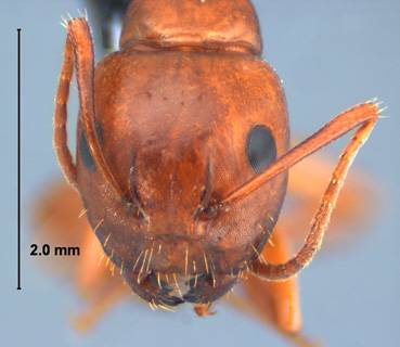 Camponotus subbarbatus, view of the head of a major worker. Note the long erect setae along the margins of the clypeus and the numerous erect setae on the cheeks. |