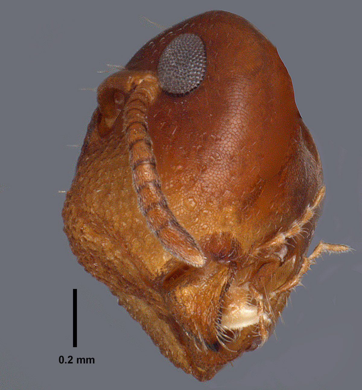 Colobopsis impressa, angled view of the head of a major worker (photo by Joe A. MacGown) |