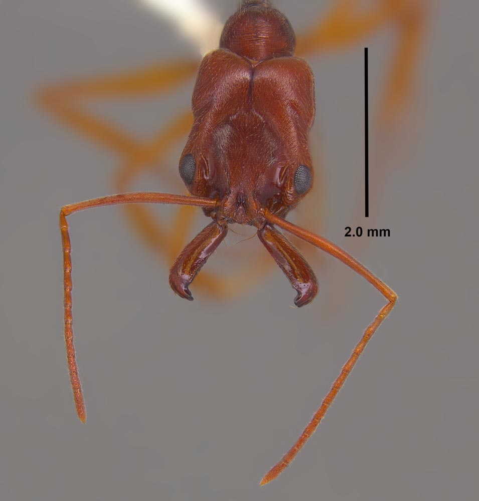 Ants in this genus differ from other ponerine ants found in the United States by the unique head shape; peculiar mandibles, which are elongate and inserted near the center of the clypeus (see photo above); the large tapering petiole; and the large size of the workers (for a more detailed diagnosis of the genus, see MacGown et al. 2014). Members of this genus are commonly called trap-jaw ants due to their elongate mandibles, which can be opened to 180°, then snapped rapidly together on prey. These ants are amazing in their ability to control and time the mandibular movement. When necessary, an ant can forcibly close the mandibles against a surface or other organism and actually propel itself away for up to several inches! Remarkable behavior. Additionally, they can use the mandibles for much more sensitive movements such as caring for larvae or nest building.