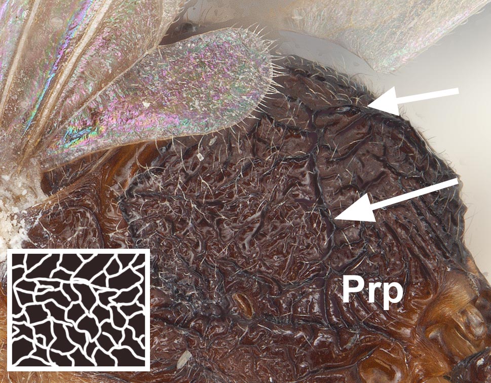 Male: HL 0.88–0.96, HW 1.10–1.20, SL 0.15–0.18, EL 0.58–0.64, EW 0.32–0.38, OL 0.15–0.18, OES 0.22–0.23, WL 2.28–2.50, PTH 0.72–0.76, PTL 0.42–0.48;, FWL 4.08–4.60 (n=5). Head, mesosoma, and petiole generally shiny except where obscured by dense pubescence; head and mesosoma yellowish-brown with a darker brown infuscation on pronotum, propodeum dark brown, gaster yellowish-brown to darker brown, antennae and legs pale yellowish-brown. Head, meso- and metasoma with abundant fine, white pubescence except on anepisternum where pubescence is mostly absent. Eyes relatively large, maximum diameter of each eye 50–60% of the length of the head in full-face view. Ocelli relatively small, length of each ocellus less than distance between lateral ocellus and eye margin; in full-face view, lateral ocelli only protrude slightly beyond posterior border of head. Mesosoma: pronotum lacking sculpture; mesoscutum feebly shining, lacking obvious sculpture; mesoscutellum raised and rounded, with longitudinal striae; propodeum with distinct declivious face in profile, strongly rugoreticulate; mesopleuron mostly lacking striae. Petiole bluntly rounded apically, with triangular subpetiolar process anteriorly; densely pubescent anteriorly and laterally, but reduced pubescence posteriorly.