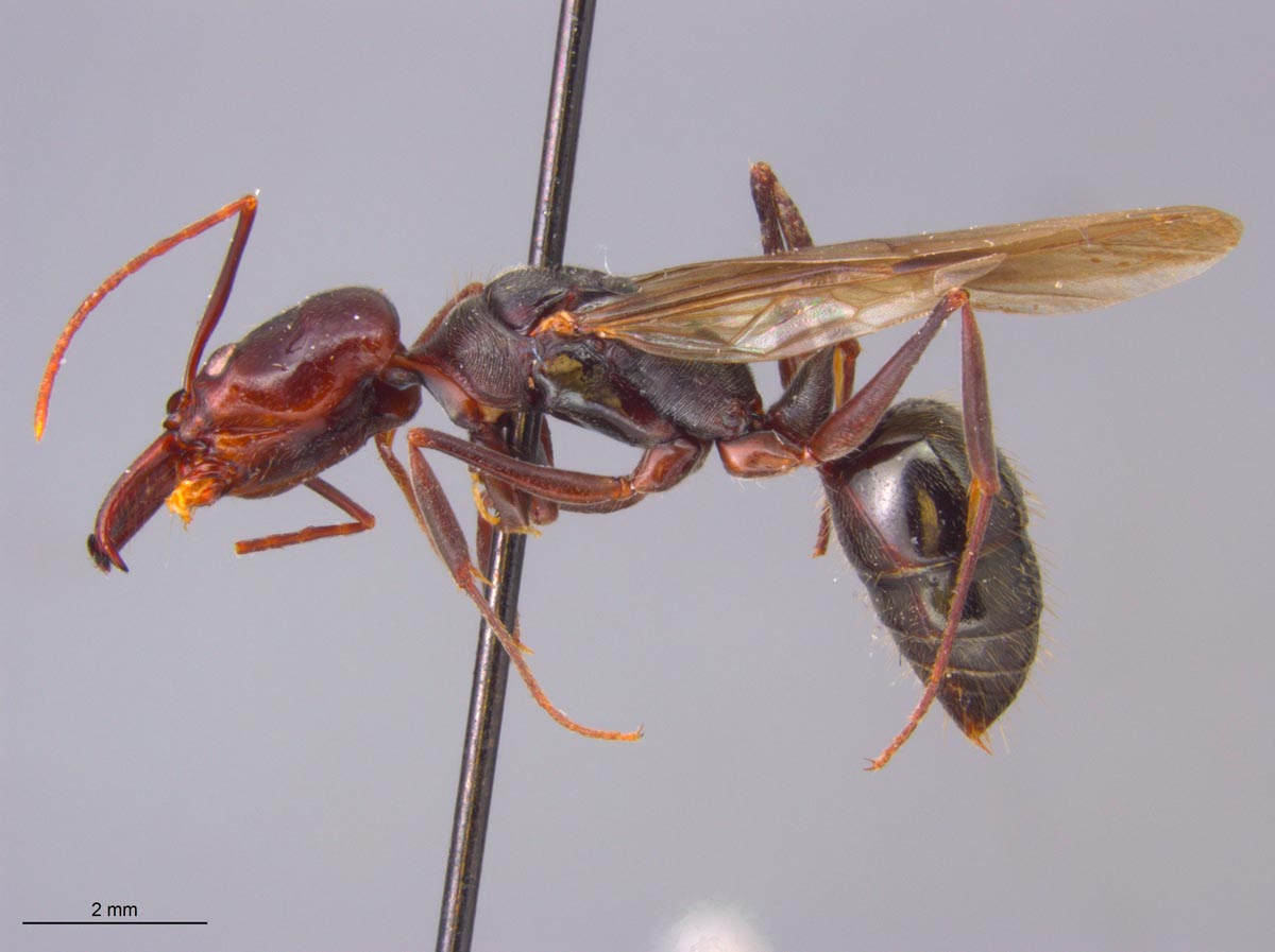 Female: HL 2.34-2.75 mm; HW 2.08-2.23 mm; ML 1.46-1.56 mm SL 2.34-2.38 mm, EL, 0.48-0.5 mm, OL, 0.08-0.10 mm, PTH 1.444-1.56 mm, PTL 0.64-0.70 mm, WL 3.50-3.85 mm (n=4). Similar and color and other features to worker, but larger, with enlarged mesosoma for flight muscles, and with fully developed wings.
