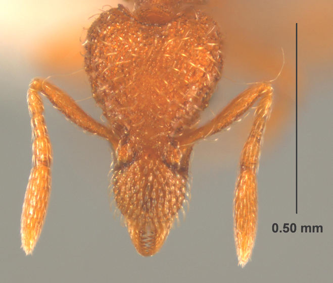| Strumigenys clypeata, in the clypeata group, is a distinctive species with a broadly rounded clypeus (anteriorly); small dense appressed spatulate hairs on clypeal dorsum and slightly larger spatulate hairs on the lateral portions of the clypeus that project as a regular fringe, which curves anteriorly; relatively fine small teeth; and a number of flagellate hairs on the head (see photo of face above). This generally appears to have a small diastema, but the length of that gap is variable and it keys out twice in Bolton's key (2000) because of that variability. |