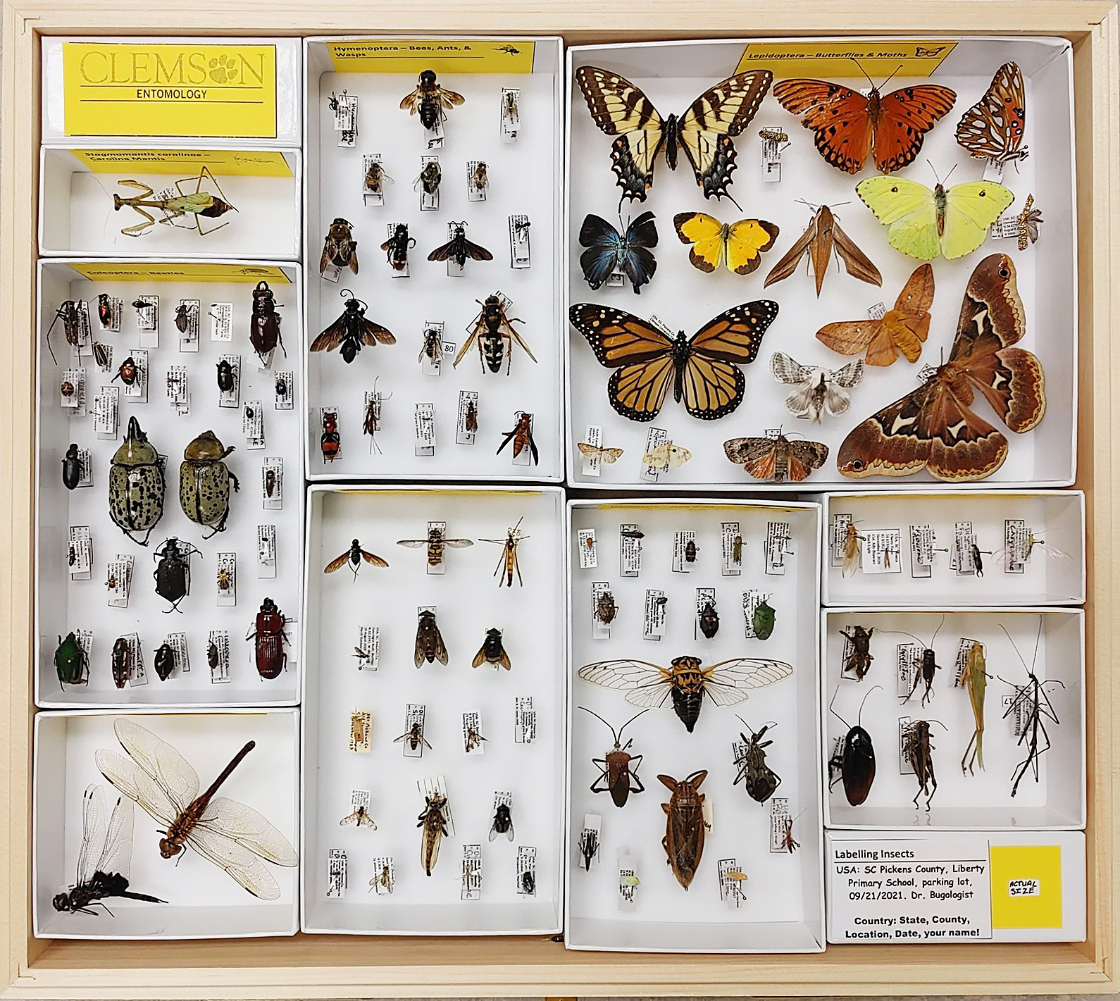 The MiMs project was started by staff and students at Clemson University in South Carolina, and now Dr. Pat Wooden has brought the project to the Mississippi Entomological Museum in Mississippi. MIMs are mini-museums. Each mini-museum is a glass topped insect drawer with 100 pinned specimens including the state insects and other commonly encountered insects. Drawers are loosely organized by order and contain families from the five major insect orders (Coleoptera, Diptera, Hemiptera, Hymenoptera,and Lepidoptera) and assorted other superorders. People learn from examples, so only specimens that have been properly pinned, pointed, and labeled are included. This way, students can see what a real museum looks like, albeit on a smaller scale. Families of insects, or even particular species, are selected to facilitate lessons in ecosystem services, integrated pest management, and conservation. For example, every drawer includes pollinators (e.g., bees and moths), agricultural and urban pests (e.g., Japanese beetles and smoky brown cockroaches), and invasive species (e.g., the kudzu bug).